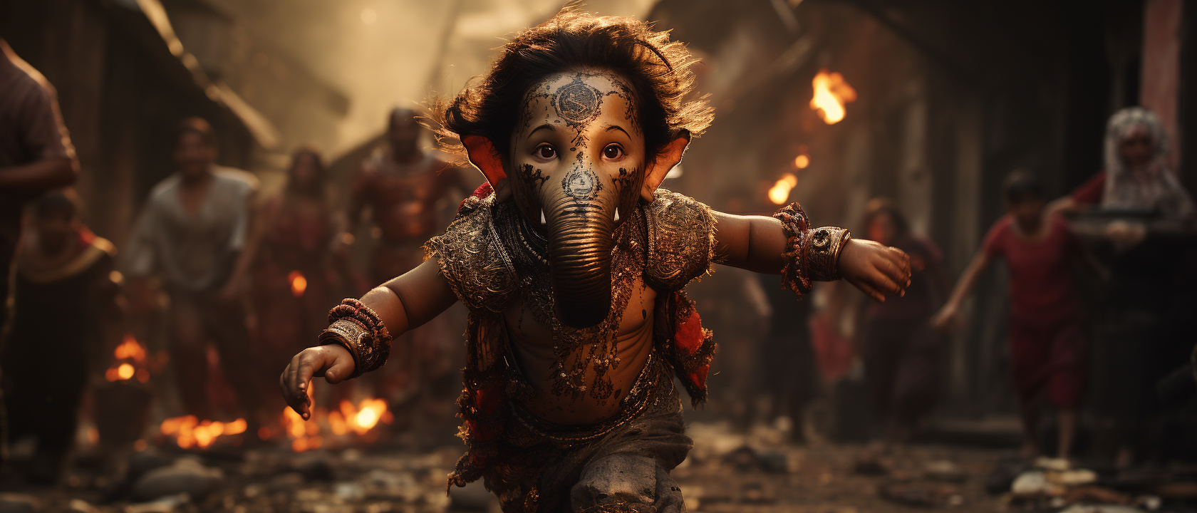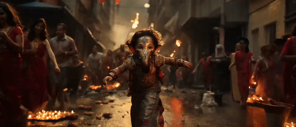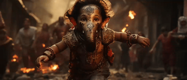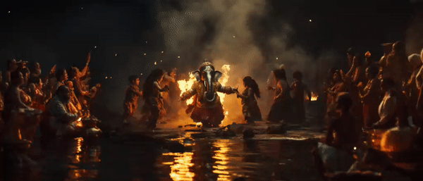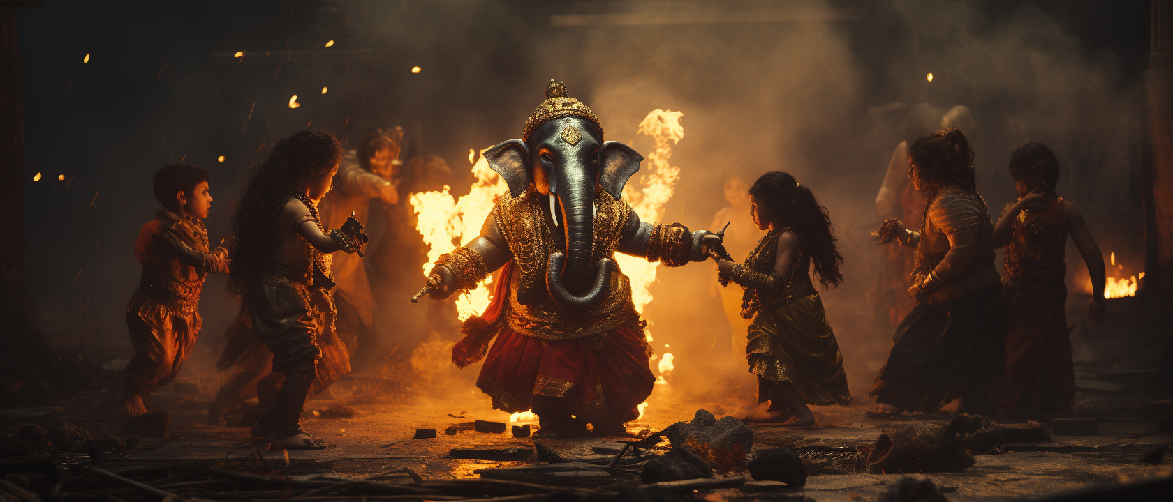 Lord Ganesh playing and dancing with his little cute devotees. Initial experiment on cinematic concept and look. Images generated with AI Midjourney.