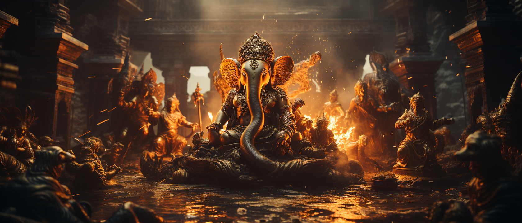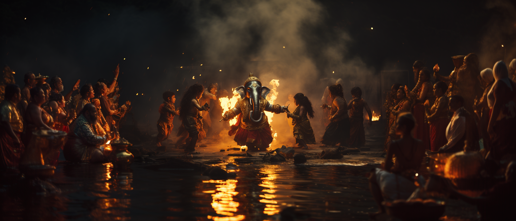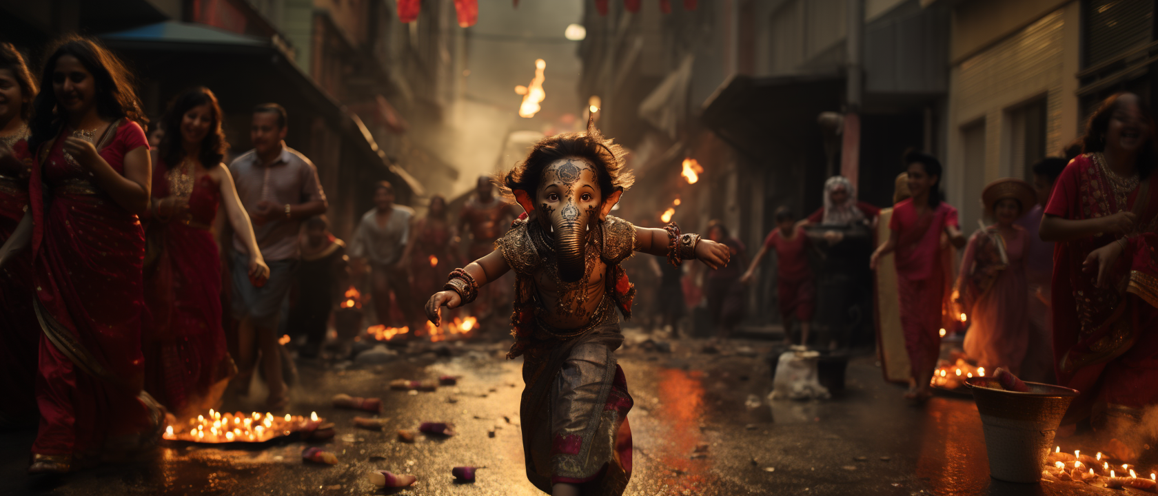 Lord Ganesh playing and dancing with his little cute devotees. Initial experiment on cinematic concept and look. Images generated with AI Midjourney.